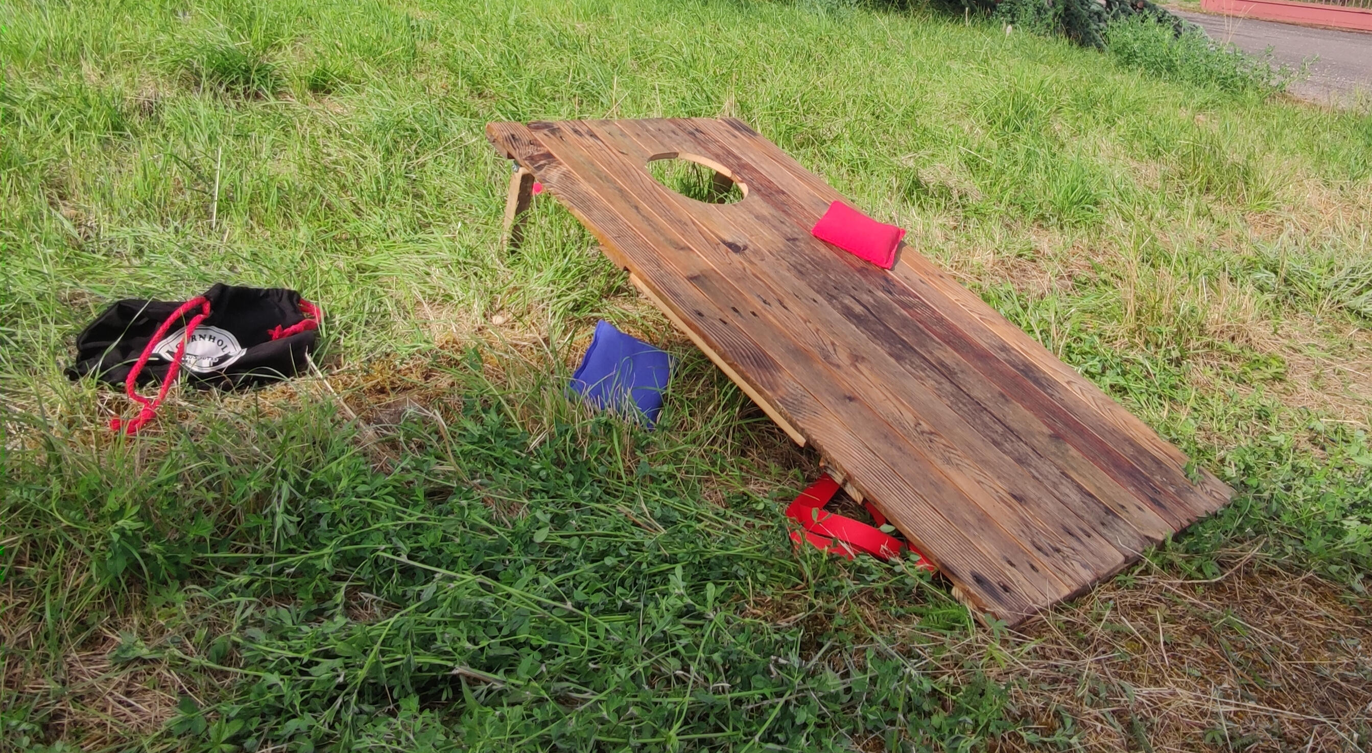 Le cornhole, jeu d'extérieur qui nous vient tout droit des États-Unis, dans lequel les joueurs lancent tour à tour des sacs remplis de grains de maïs (d'où le nom Cornhole, contraction des mots maïs et trou) ou de granulés plastiques sur la plateforme inclinée opposée, percée d'un trou. Ce jeu se compose de 2 planches rectangulaires et de 8 sacs en tissu de deux couleurs différentes.